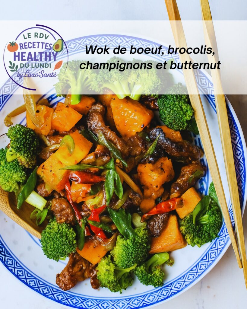 Atout healthy : Bœuf maigre pour une protéine de qualité, brocoli riche en vitamine C et fibres, champignons pour les antioxydants, et courge butternut pour la vitamine A, avec une touche d’huile minimale.